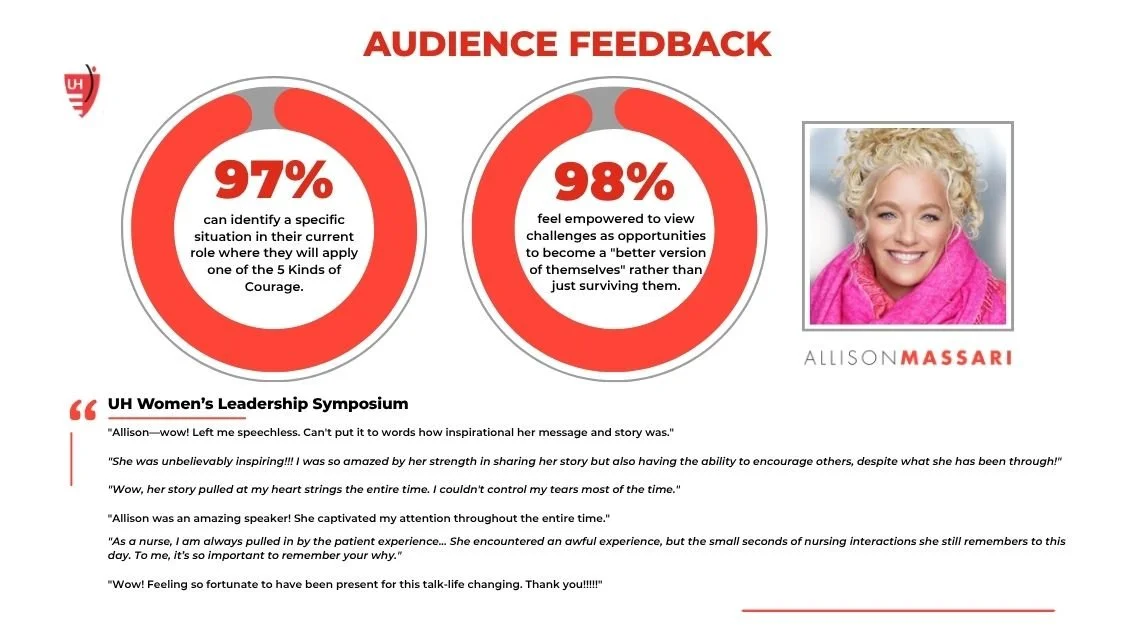 With profound insight and compassion, Allison speaks to the challenges, the importance, and the delicate nature of healthcare today. As an advocate for both patients and healthcare professionals, her unforgettable keynote addresses burnout, time restraints, retention, and the everyday stresses of their work, while shining light on the medical team’s immense value to a patient who is suffering. She explains, “The power of what you do goes far beyond the technical part of your job. You are healing the places medicine cannot touch. In fact, YOU are the medicine.”